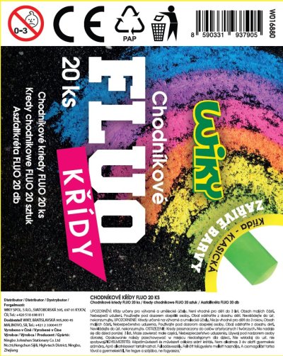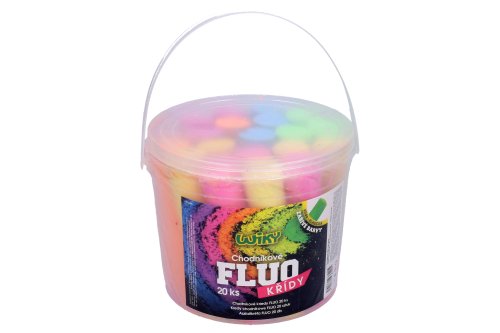 Chodníkové křídy FLUO v kyblíku 20ks. Zářivé barvy - klasický hrot. Barvy: modrá, zelená, fialová, citrónová, žlutá, oranžová.