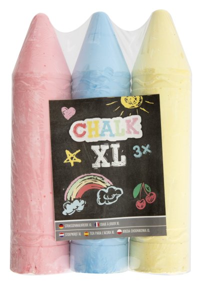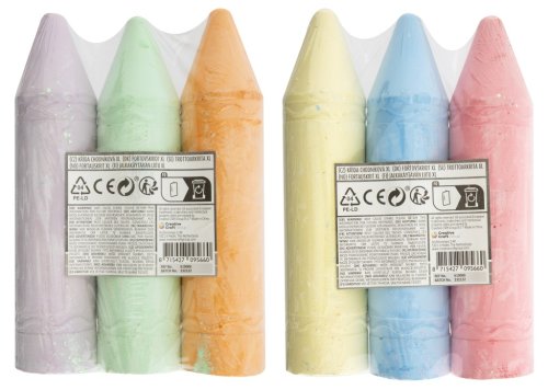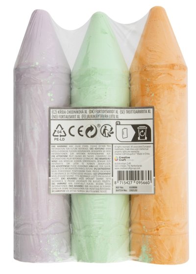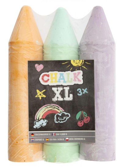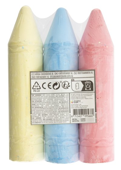 Křídy XL 3 ks v balení. Velikost křídy 19 cm. Dva druhy – tři barvy žlutá, modrá a růžová nebo oranžová, zelená a fialová.