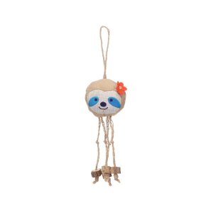 Textilní hračka ve tvaru lenochoda kombinuje různé druhy látek včetně plátna a plyše.