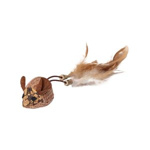 Hračka ve tvaru myšky je vyrobená z měkkého úpletu, korku a juty.