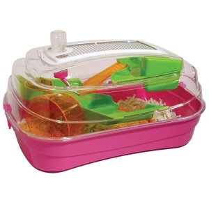 Plně zařízená plastová klec pro drobné druhy křečků a myší.