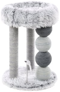 Stylové škrabadlo pro kočky s odpočívadlem a hračkou.