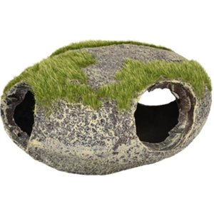 Dekorace do akvária v podobě oblého kamene, který je porostlý mechem.