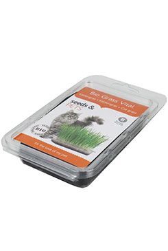 Miska se zeminou a semeny pro vlastní pěstování kočičí trávy.