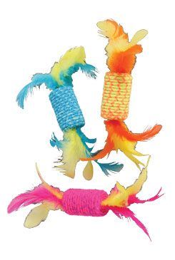 Hračka pro kočky, barevný míček se zajímavým péřovým koncem, který poutá kočočí pozornost.