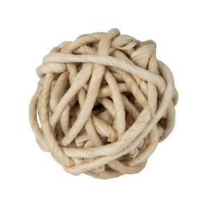 Škrabadlo ve tvaru koule s hračkou, kombinace dřeva, sisalu a juty.