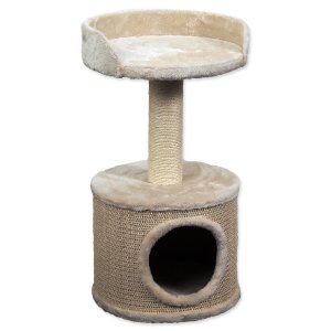 Odpočívadlo ve tvaru válce s plyšovým potahem, odpočinkovým místem s polštářkem uvnitř a škrabadlem v horní části.