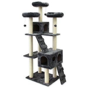Odpočívadlo s plyšovým potahem, škrabadlem, plochami k odpočinku a hračkou.