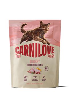 Receptura s čerstvým krůtím masem naprosto respektuje specifické výživové potřeby sterilizovaných koček.
