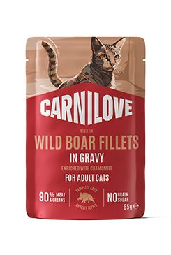 Jemné masové filety v delikátní šťávě pro dospělé kočky s divočákem, výraznou bílkovinou ze zvěřiny, která plně odpovídá přirozeným výživovým potřebám koček.