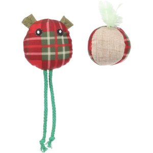 Vánoční hračky pro kočky ve tvaru myši a míčku jsou vyrobeny z různých druhů tkanin (plátno a plyš).