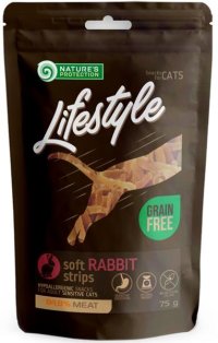 Doplňkové krmivo pro kočky Nature's Protection Lifestyle Cat Snack Soft Rabbit Strips – měkké králičí proužky.