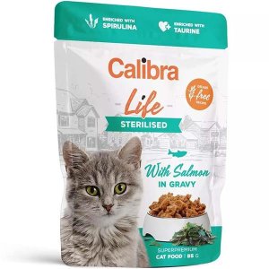 Receptura s lososem – masové kapsičky pro dospělé kastrované a sterilizované kočky obsahuje vysoké množství masa 76 % ve filetech v omáčce.