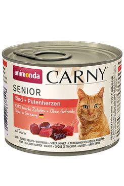 Konzerva s hovězím masem a krůtími srdíčky pro starší kočky.