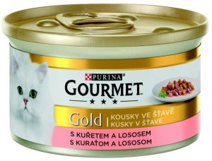 Kousky ve vlastní šťávě s lososem a kuřecím.