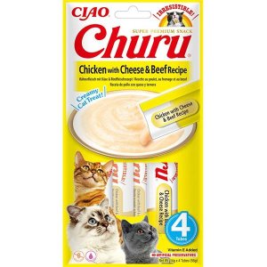Churu masové pyré pro kočky s kuřecím, hovězím masem a se sýrem.