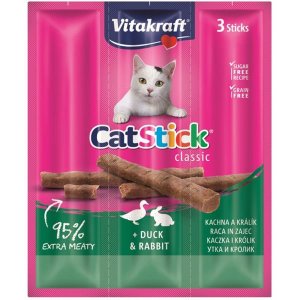 Šťavnaté tyčinky s masem z králíka a kachny.Doplňkové krmivo pro dospělé kočky.Vhodné jako chutný snack. Složení: maso a produkty živočišného původu, sušené krmné kvasnice, minerální látky, cukr.Jakostní znaky:hrubé proteiny 31%, vlhkost 27%, hrubé oleje a oleje a tuky 20%, hrubé popeloviny 9%, hrubá vláknina 2%.Krmný návod: podávejte jako pamlsek 1 - 2 tyčinky denně.