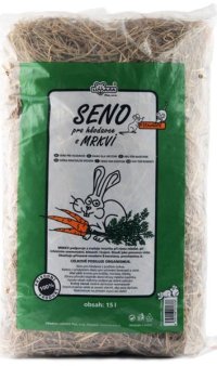Chutné seno pro králíky, morčata nebo činčily s vysokým podílem vlákniny a s čerstvou mrkví.