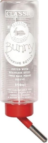Plastová napaječka pro činčily, králíky.uchycení pomocí drátu nebo na zavěšenítrubička na pití z nerezové oceli s kovovou kuličkouobjem: 450 mlbarva: různá