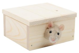 Domeček z měkkého dřeva s rovnou střechou pro křečky, křečíky, myši a jiné malé hlodavce.