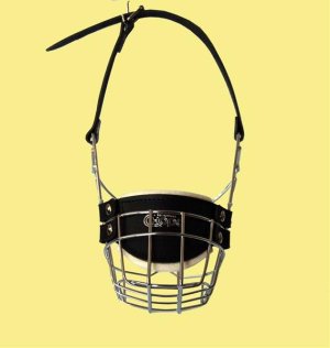 Kovový náhubek s upínacími řemínky z barexu.