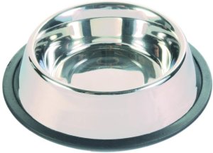 Výškově nastavitelný stojan s nerezovými miskami o průměru 21 centimetrů.