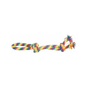 Odolné bavlněné přetahovadlo pro psy je spletené z pevných barevných provázků a má uzly pro lepší úchop při hře.