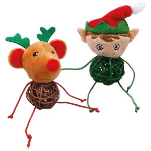Vánoční hračky pro kočky mají podobu elfa nebo soba s plyšovou hlavou, tělem z proutěného míčku a nohama a rukama z provázků.