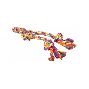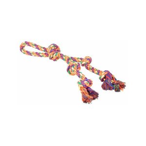 Odolné bavlněné přetahovadlo pro psy je spletené z pevných barevných provázků a má uzly pro lepší úchop při hře.