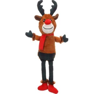 Vánoční hračka pro psy ve tvaru soba s šálou kolem krku je vyrobena z hebkého plyše.