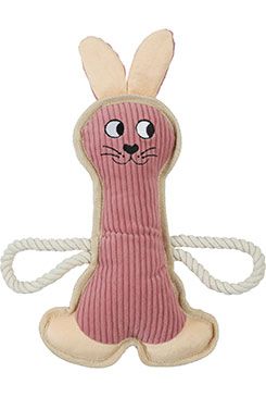 Pískací hračka ve tvaru králíka s odolným kroužkem.
