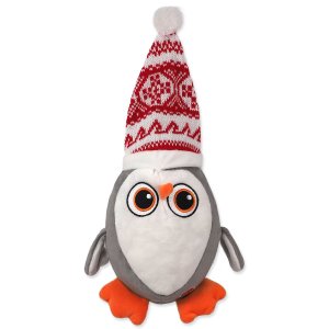 Vánoční hračka pro psy v podobě velkého tučňáka s čepicí, který píská.