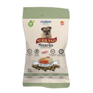Lahodný pamlsek pro psí seniory ve tvaru malých kostiček se serrano šunkou, krůtím masem a rýží.