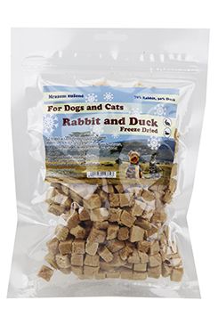 Masová pochoutka pro psy a kočky, králičí a kachní maso kostky sušené mrazem. Složení: 70% králík, 30% kachnaAnalytické složky: 62% hrubý protein, 21% hrubý tuk, 7,5% hrubý popel, 1% hrubá vláknina, 8% vlhkost Zajistěte zvířeti pitnou vodu.