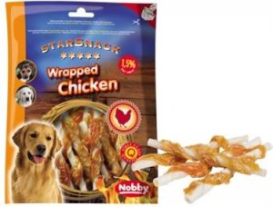 Žvýkací tyčinky pro psy – sušená hovězí kůže obalená kuřetem.
