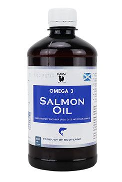 Doplňkové krmivo pro psy a kočky, stoprocentní lososový olej získávaný ze suroviny potravinářské kvality.