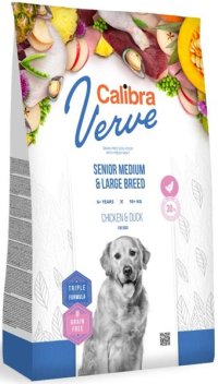 Calibra Dog Verve Senior Medium & Large Breed (Chicken & Duck) je kompletní suché krmivo s čerstvým masem a bez obilovin.