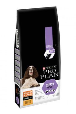 PRO PLAN Medium & Large Adult 7+ s OPTIAGE pro psy středních a velkých plemen starší 7 let. Granulované krmivo s obsahem kuřecího masa.