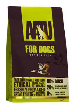 AATU Kachna – (Duck)Kompletní krmivo pro dospělé psy SLOŽENÍ: 80 % kachna (z toho 65 % čerstvě připravená kachna, 12 % sušená kachna, 2 % čerstvě připravená kachna, 1 % kachní tuk), hrách (10,5 %), batáty (3 %), cizrna (1,8 %), tapioka, minerály, zeleninová omáčka (0,5 %), jablko, lososový olej (0,4 %) ovocná a bylinková směs (brusinky, hruška, borůvka, moruše, mrkev, rajčata, čekanka, petržel, máta peprná, spirulina, mořské řasy, oregano, šalvěj, majoránka, tymián, heřmánek, šípky, kopřiva dvoudomá, juka, měsíček, anýz, pískavice, skořice, 0,04 %)glukosamin (178 mg/kg), methylsulfonylmethan 178 mg/kg, chondroitin-sulfát 125 mg/kg. ANALYTICKÉ SLOŽKY: Bílkoviny 33 %, obsah tuku 19 %, hrubá vláknina 2,8 %, hrubý popel 9 %, vlhkost 8 %, omega 3 – 0,65 %, omega 6 – 2,4%. DOPLŇKY (NA 1 KG): Vitamíny : vitamín A 18000 IU, vitamín D3 1400 IU, vitamín E 200 mg, L-karnitin 200 mg. STOPOVÉ PRVKY: zinek (chelát zinku jako hydrát aminokyselin) 100 mg, železo(aminokyselinový chelát dvojmocného železa, hydrát) 60 mg, měď (aminokyselinový chelát dvojmocné mědi, hydrát) 7 mg,mangan (aminokyselinový chelát manganu, hydrát) 6 mg, jód (jodid draselný) 1,5 mg, selen (jako selenizované kvasinky Saccharomyces cerevisiae CNCM I-3060, inaktivované, preparát z organického selenu) 0,05 mg. TECHNOLOGICKÉ DOPLŇKY: Antioxidanty: tokoferolové výtažky z rostlinných olejů. ZOOTECHNICKÉ DOPLŇKY: probiotikum Enterococcus faecium (DSM 10663 NCIMB 10415) 3,5 x 1010 KTJ/kg. DÁVKOVÁNÍ: