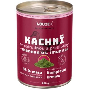 Kompletní krmivo pro psy všech plemen bez rozdílu věku. Šťavnatá konzerva obsahující 95 % mletého kachního masa v pevné složce.
