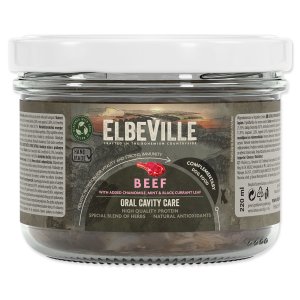 Sklenice Elbeville s hovězím masem a bylinkami pro svěží dech a zdravou dutinu ústní Chutné krmivo nejvyšší kvality z hovězího masa doplněné o bylinnou směs od bylinkářství LEROS.