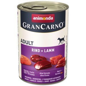 Superprémiová konzerva pro psy s jehněčím a kousky kuřecí svaloviny.