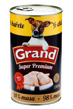 Konzerva Grand premium 1/2 celého kuřete je kompletní, prémiové krmivo pro psy, vytvořeno z čerstvého masa bez chemických přísad.