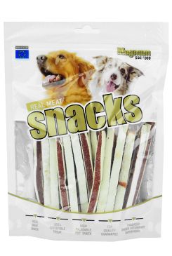 Měkká, přírodní masová pochoutka z kuřecí svaloviny formovaná do proužků. Slouží jako odměna při hře, výcviku nebo jako doplněk stravy při cestách. Složení:kuřecí maso, škrob, sorbitol, glycerin.Analytické složky:hrubý protein 40 %, obsah tuku 1 %, hrubý popel 4 %, hrubá vláknina 2 %, vlhkost 23 %. Skladování:Uchovávejte na suchém a chladném místě.Po otevření dobře uzavírejte zipovým uzávěrem obalu.Nepodávejte svému zvířeti vysoušecí činidlo - desiccant.Není určeno ke konzumaci lidmi.