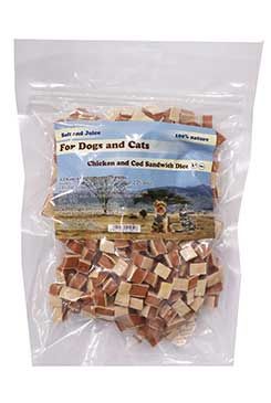 Masová pochoutka pro psy a kočky, sandwich treska a kuře měkký mini. Složení: 88% kuře, 10% treska, 2% škrobAnalytické složky: 33% hrubý protein, 2,9% hrubý tuk, 2,5% hrubý popel, 0,1% hrubá vláknina, 23% vlhkost Zajistěte zvířeti pitnou vodu.