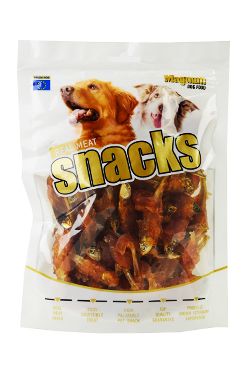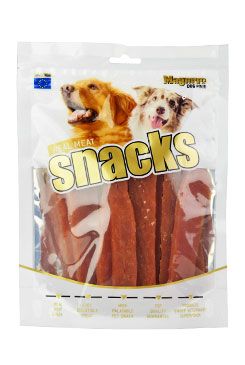 Doplňkové krmivo pro psy a kočky vyrobené ze 100% čerstvého masa, bez chemických konzervantů. Složení: Kuřecí maso 45%,Vepřová kůže 50%, Škrob 2%, Glycerin 2%,Přírodní sladidlo (maltitol) 0,9%, Ocet 0,1%.Jakostní znaky: Protein 62%, vlhkost 18%, obsah tuku 1%, hrubá vláknina 1%. Krmný návod: Podávejte jako příležitostný pamlsek.Zajistěte zvířeti přístup k čerstvé vodě.Skladujte při teplotě do 20 °C a relativní vlhkosti vzduchu do 60 %, zabraňte přímému slunečnímu světlu.