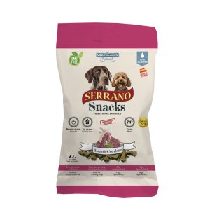 Lahodný pamlsek pro psy ve tvaru malých kostiček jehněčím masem, serrano šunkou a rýží.