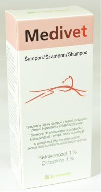 Speciální a účinný šampon Medivet k řešení závažných projevů šupinatění a svědění kůže zvířat.
