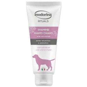 Šampon pro psy s bílou a světlou srstí.