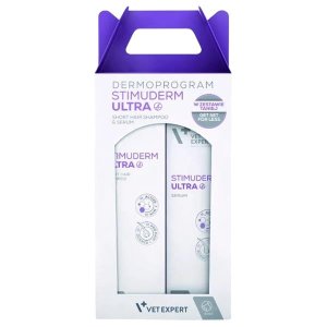 Stimuderm Ultra Dermoprogram Short Hair je dvoustupňová péče pro krátkosrsté psy, sestávající z šamponu a séra. Balení obsahuje dva produkty ( Stimuderm Ultra Short Hair Shampoo a Stimuderm Ultra Serum ), které tvoří kompletní sadu pro péči o kůži a srst psů s nadměrným vypadáváním srsti z různých příčin a/nebo oslabenou srstí.